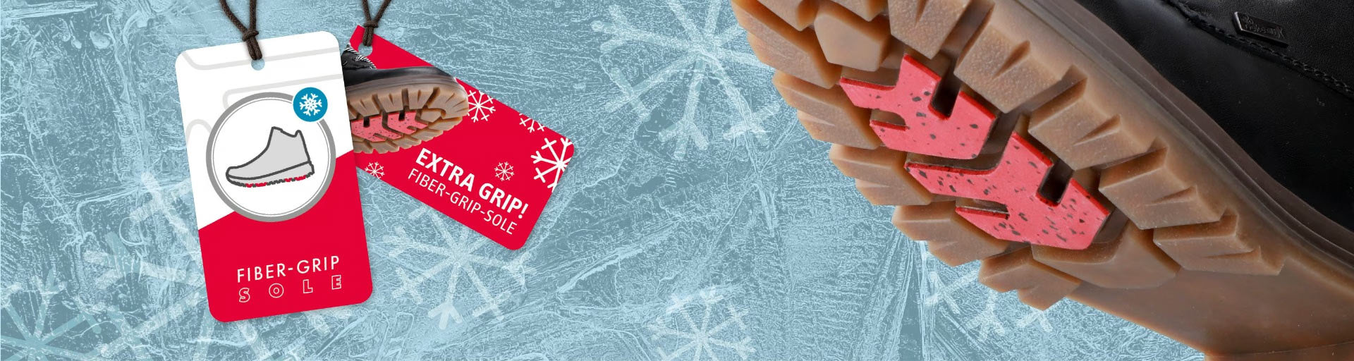 Rieker Fiber-Grip-sålen har gripende områder som er ispedd mikroskopiske glassfibre og dermed har en ru overflatestruktur som gir det ekstra grepet på isete underlag. Glassfibrene er knapt synlige for det blotte øye, men fiberelementene som er innlemmet i yttersålen, gjenkjennes på den røde fargen. De er lette og integrert i sålens slitebane, slik at de ikke påvirker gangkomforten. Gå trygt