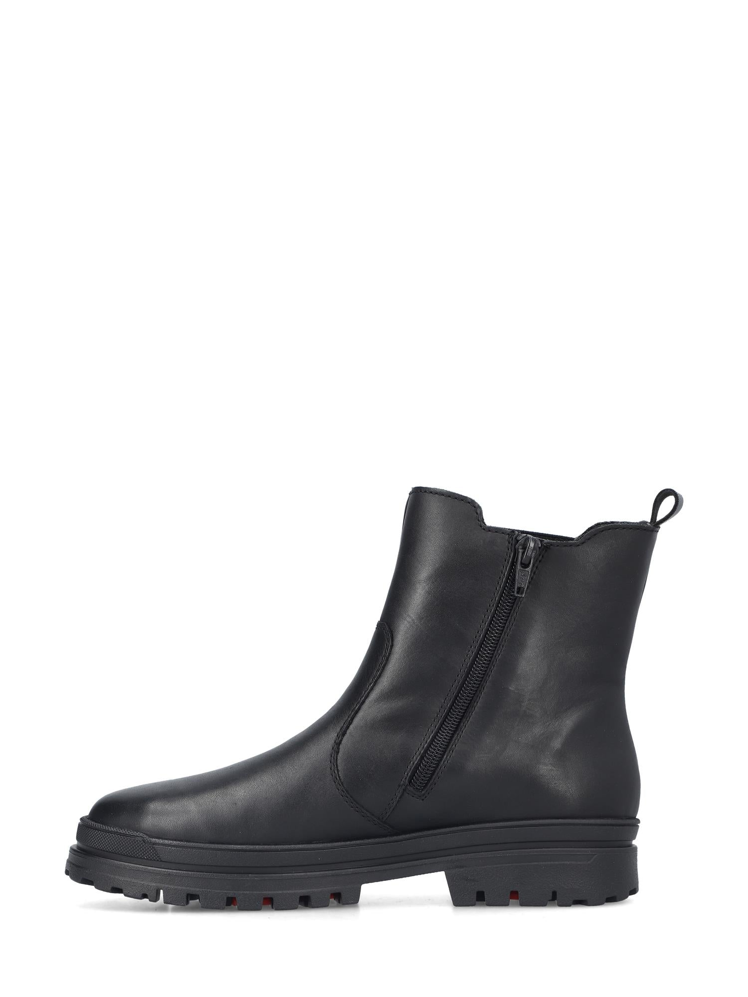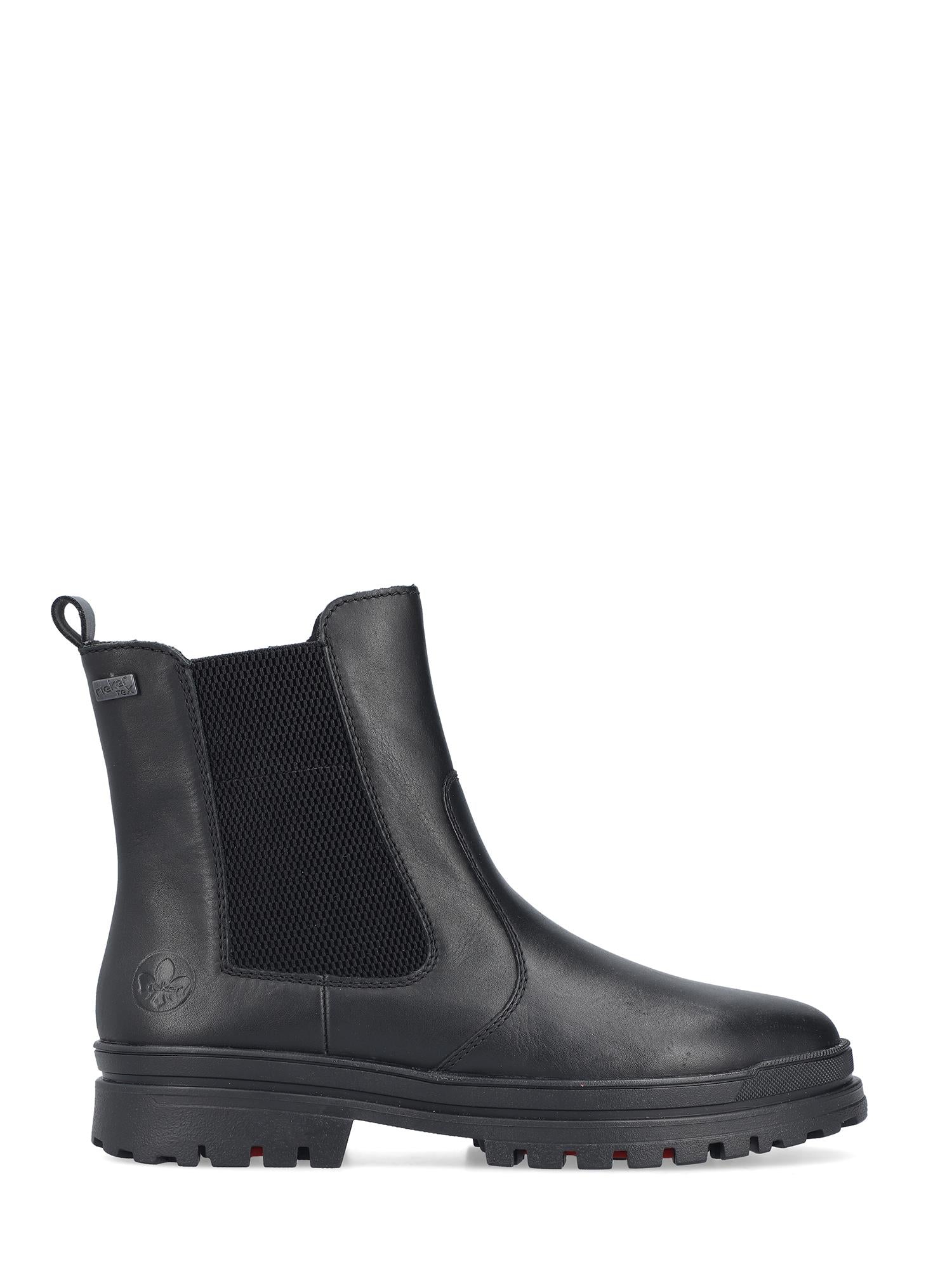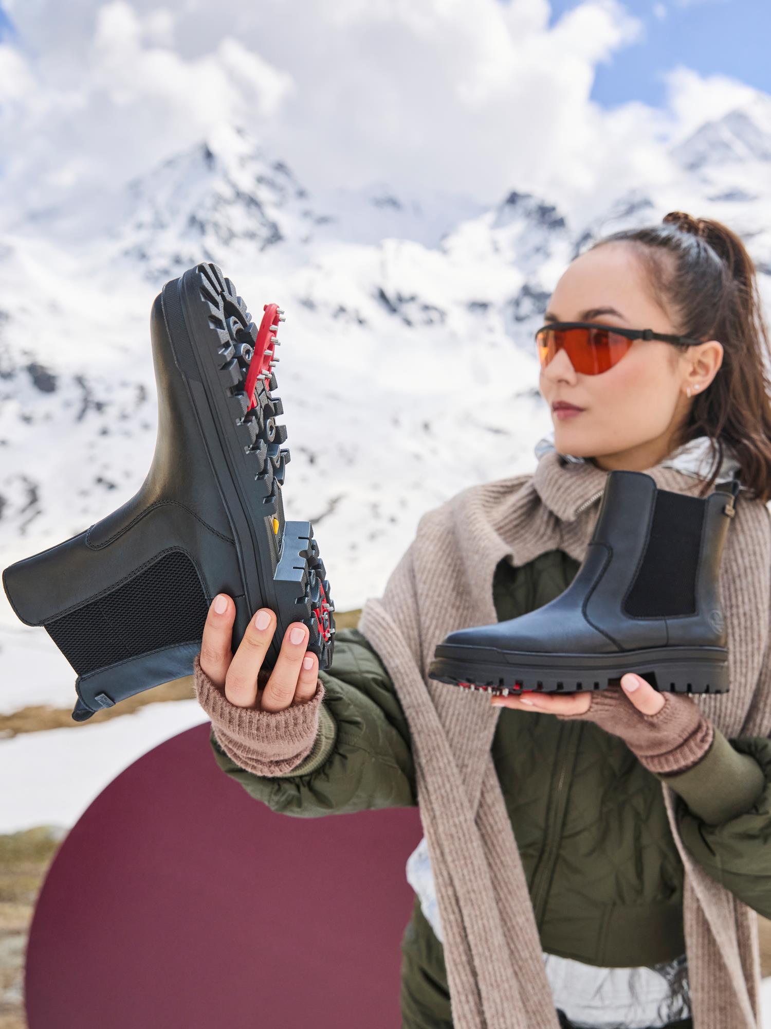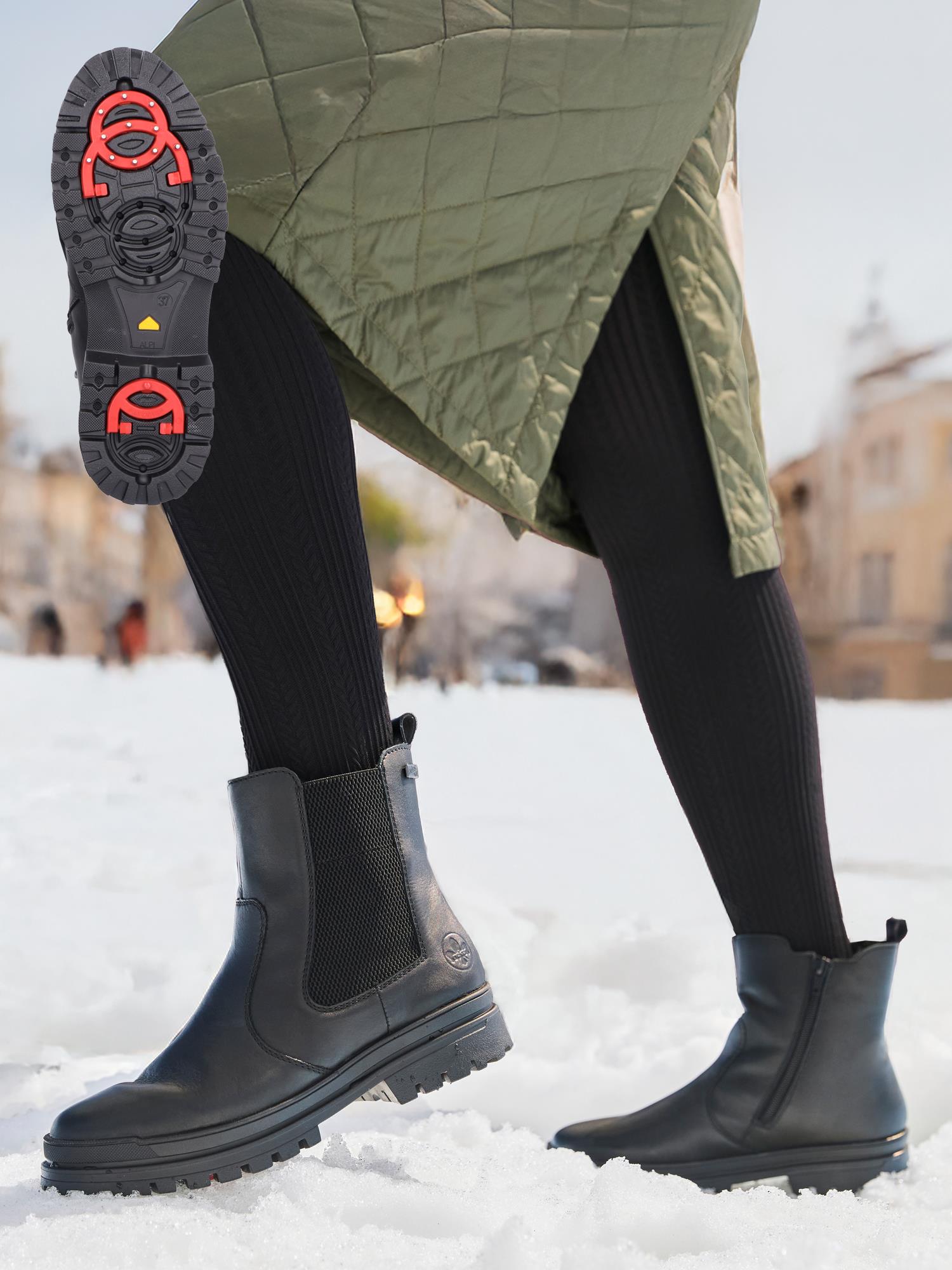 Chelsea med utfellbare brodder er en elegant og funksjonell ankelstøvlett for kvinner som kombinerer moderne design med praktiske vinteregenskaper. Modellen er laget i svart skinn med elastiske sidepaneler som gir god fleksibilitet og passform, mens den innvendige glidelåsen gjør det enkelt å ta skoene av og på. Innsiden er foret med myk tekstil som holder føttene varme på kalde dager, og den uttakbare innersålen gir ekstra komfort og enkel rengjøring. Takket være RiekerTEX-membranen er skoen vannavvisende og pustende, slik at føttene holder seg tørre i all slags vær. Yttersålen er utstyrt med Rieker Grip-system med utfellbare brodder, som sikrer trygt grep på glatte og isete underlag – ideelt for norske vinterforhold.