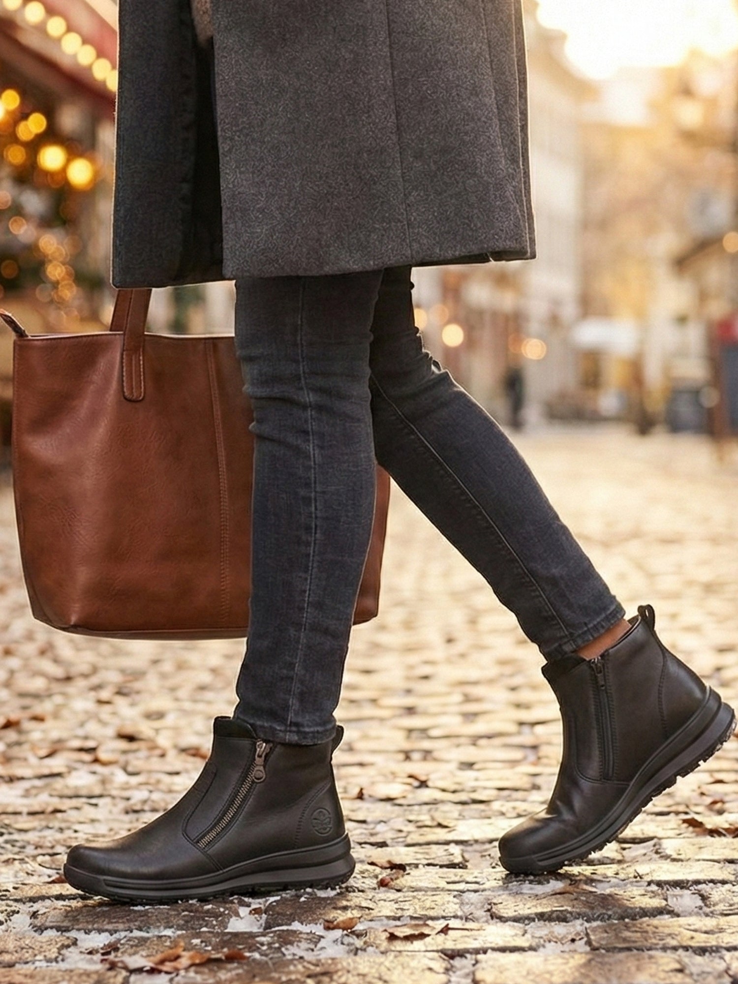 Rieker Maleni er en tidløs og komfortabel ankelboot laget i mykt skinn som tilpasser seg foten for god passform. Den har varmt tekstilfôr som holder føttene lune på kalde dager, og en uttakbar innersåle med RiekerSoft-teknologi som gir ekstra myk demping. Antistress-sålen sørger for at skoen er lett, fleksibel og støtabsorberende, noe som reduserer belastningen ved hvert steg. De doble glidelåsene på sidene gjør den enkel å ta av og på, mens den kraftige yttersålen gir godt grep på ulike underlag.