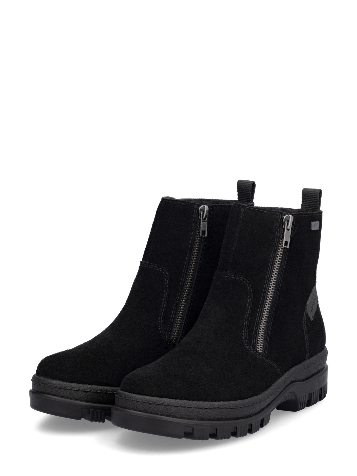 Rieker Lenera kombinerer elegant design med funksjonell komfort – perfekt for kalde dager. Overdelen er laget av mykt sort semsket skinn som gir et raffinert uttrykk samtidig som det beskytter mot vær og vind. Den praktiske glidelåsen gjør det enkelt å ta skoen av og på, mens den solide yttersålen med godt grep sørger for stabilitet på glatte underlag. Med sterkt vannavvisende RiekerTEX-membran og Flip-Grip-teknologi med utfellbare brodder står du støtt selv på is og snø. Den myke, varme innersiden holder føttene komfortable gjennom hele dagen, og den uttakbare innersålen gir ekstra fleksibilitet og hygiene.