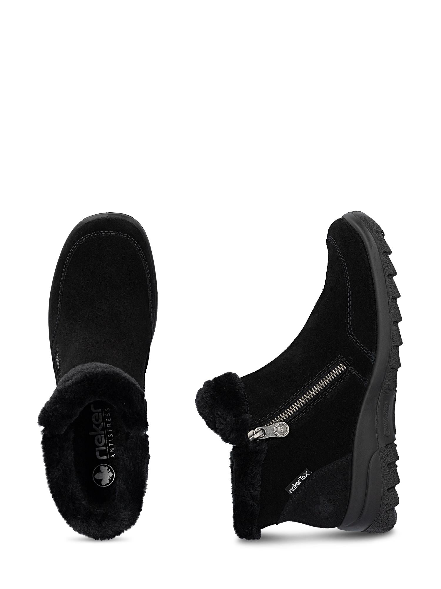 Rieker Støvlett Elara er en sort ankelstøvlett i semsket skinn, designet for både komfort og stil på kalde dager. Den praktiske glidelåsen gjør skoen enkel å ta av og på, mens den myke kragen i tekstil gir et moderne uttrykk. Modellen er utstyrt med vannavvisende RiekerTEX-membran og varmt fôr, som holder føttene tørre og behagelige gjennom vinteren. Den lette PU-sålen er støtdempende og gir en stabil og komfortabel gange, mens den lave hælen på 39 mm gir et feminint preg uten å gå på bekostning av komfort.